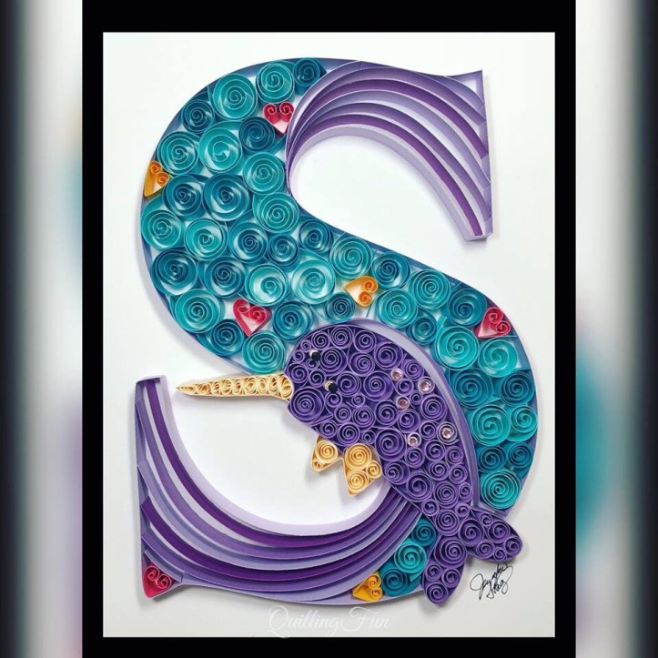 I haven’t posted about my quilling recently, as I’ve been busy doing just that and also starting back to work at the preschool. I have made a few custom quilled themed letters that I wanted to share… This particular letter was based on a little ones nursery with an Arctic theme. Her favorite stuffed animal was a purple stuffed narwhal, so I wanted to feature it in her letter. The blue represents the ocean of course and the hearts represent the parents love for their child. I love being a part of something so special…